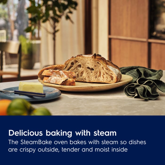 Le four SteamBake cuit à la vapeur pour que les plats soient croustillants à l’extérieur, et tendres et moelleux à l’intérieur.