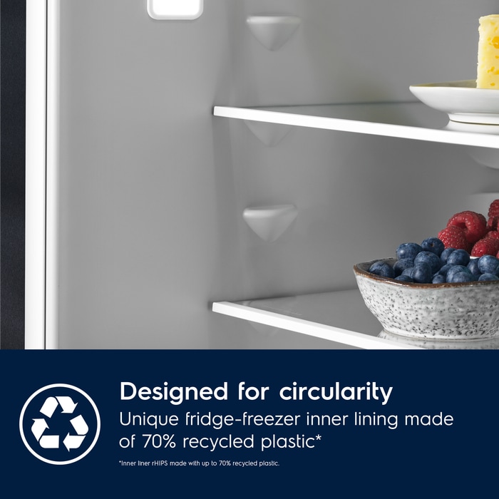 *Revêtement intérieur rHIPS fabriqué avec jusqu'à 70 % de plastique recyclé représentant 13 % du plastique total du réfrigérateur.