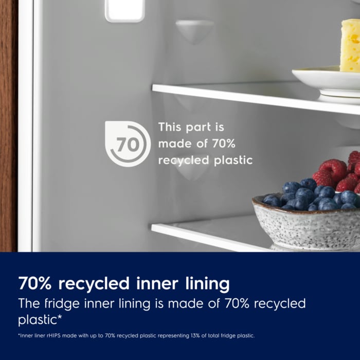 *Revêtement intérieur rHIPS fabriqué avec jusqu'à 70 % de plastique recyclé représentant 13 % du plastique total du réfrigérateur.